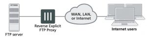 You can also configure reverse explicit FTP proxy. In this configuration, users on the Internet connect to the explicit web proxy before connecting to an FTP server installed behind a FortiGate unit.