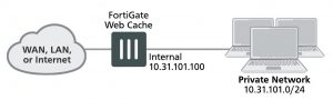 This example includes a client network with subnet address 10.31.101.0 connecting to web servers on the Internet. All of the users on the private network access the Internet though a single general security policy on the FortiGate unit that accepts all sessions connecting to the Internet. Web caching for HTTP and HTTPS traffic is added to this security policy.