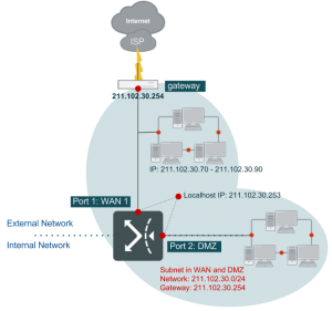 This is a typical example where ISP provides a network segment (a class C segment for example) to the user. Under such a condition, FortiWAN use one or more IP addresses, while the rest of the public IP addresses (from the assigned segment) will be under DMZ.