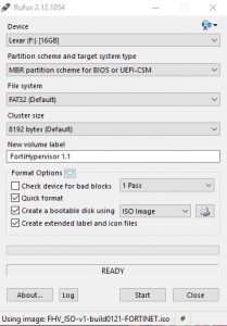 It is possible to write FortiHypervisor to a USB device for installation purposes. To achieve this, download a copy of the USB creation utility Rufus https://rufus.akeo.ie/.